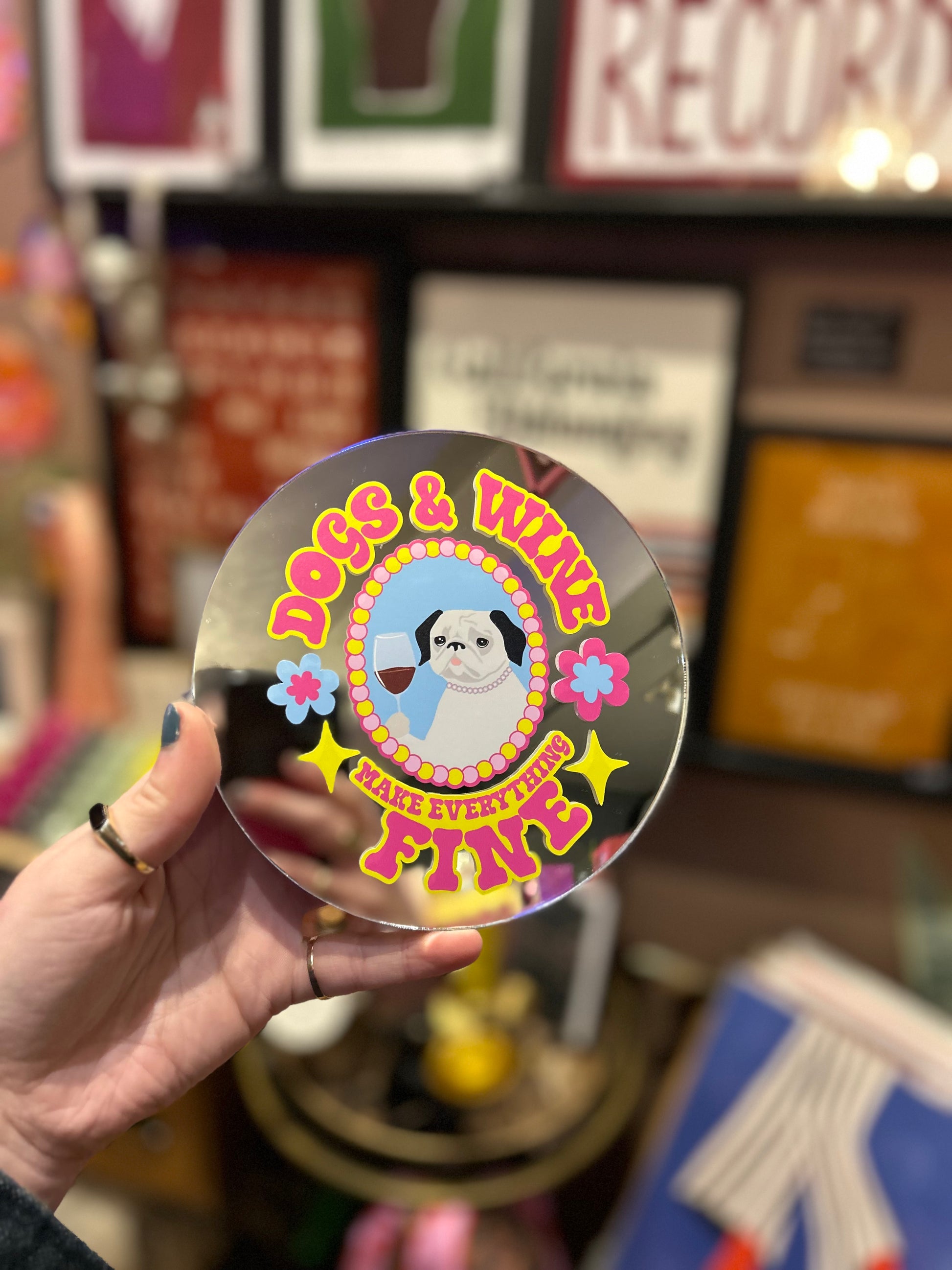 'Dogs & Wine Make Everything Fine' small circular mirror.