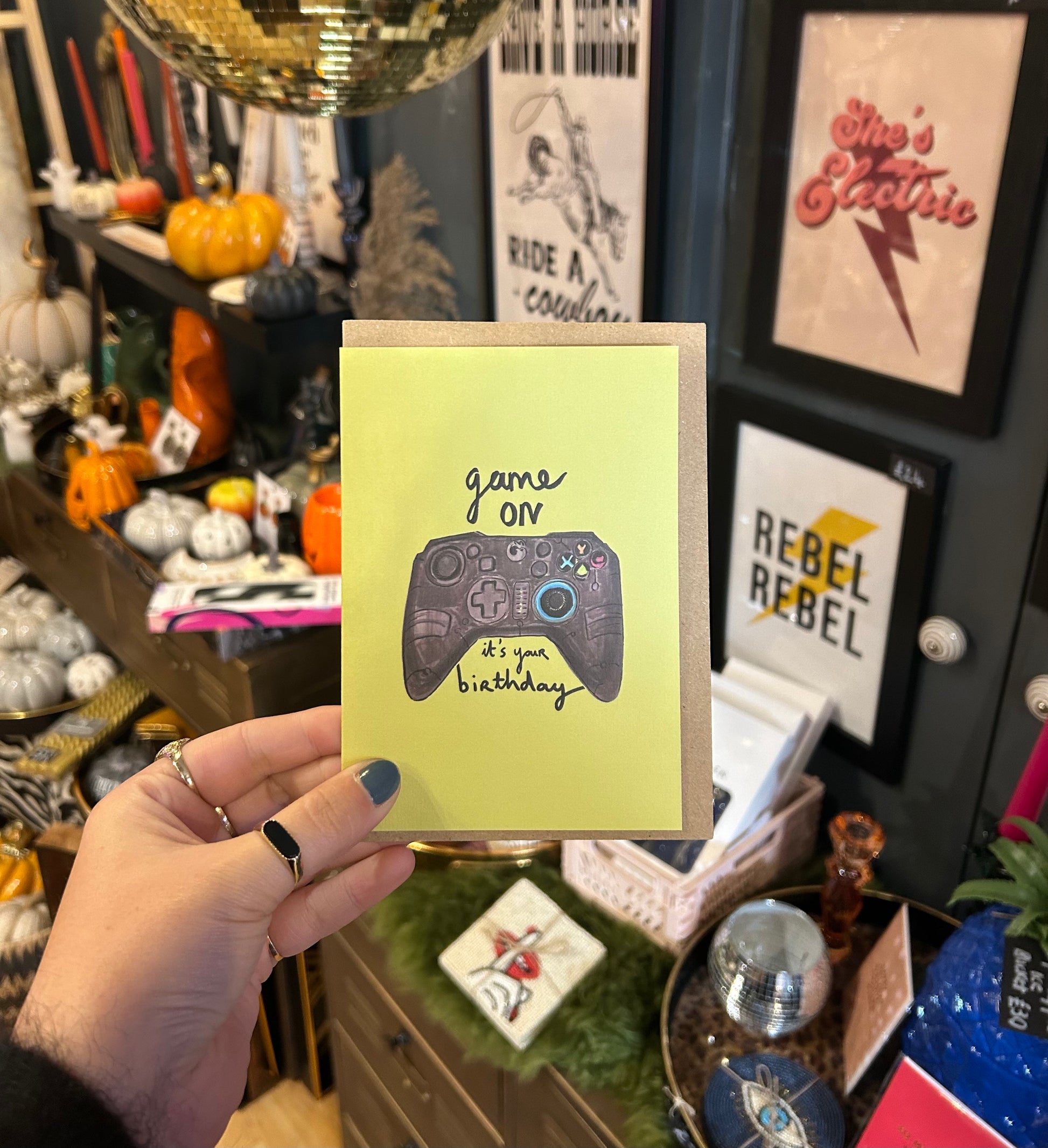 Green card with games controller illustration accompanying the message 'Game on it's your birthday'.