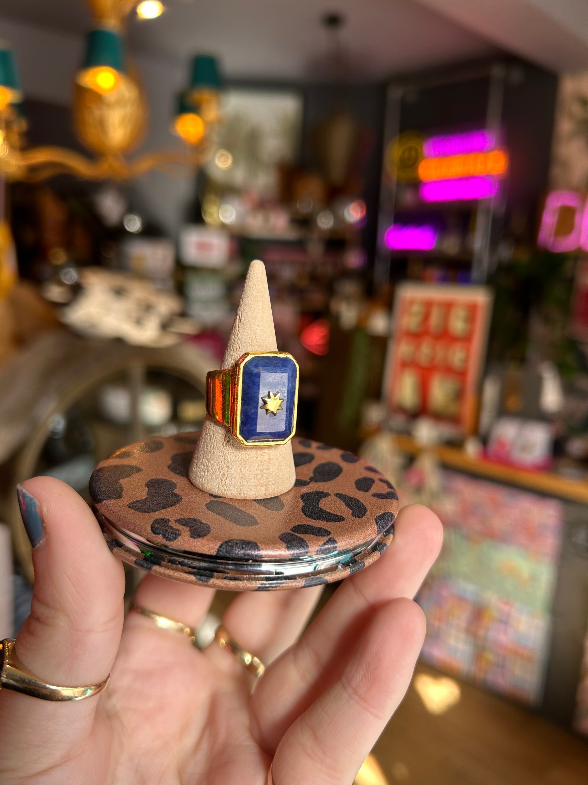 Beautiful gold statement ring featuring a Blue Sodalite stone and delicate star detailing, it’s the perfect accessory for Autumn/Winter.
